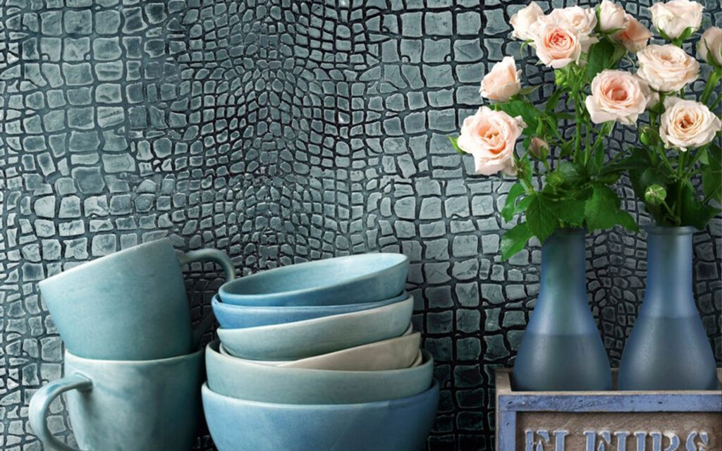 Effet texturé au charme exotique qui anime les surfaces d’une précieuse finition alligator.